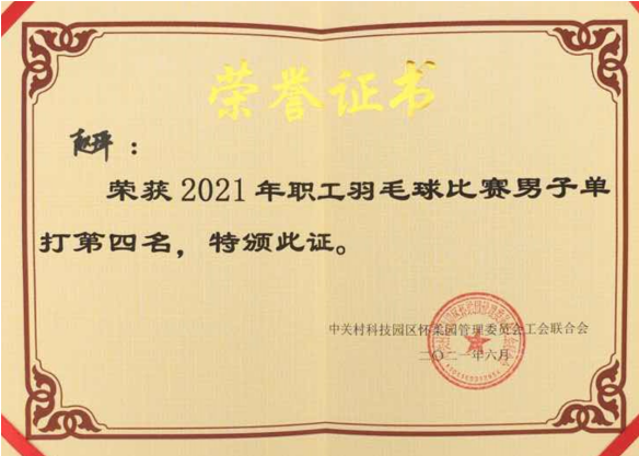 公司副總經理趙玶榮獲2021年羽毛球比賽第四名!